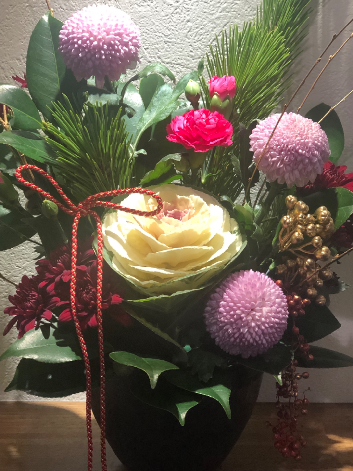 クリスマスも終わりお正月アレンジをご用意致しました。今年もたくさんのお花をご覧頂きありがとうございました。使用花材…松、ピンポンマム、スプレーカーネーション、椿他