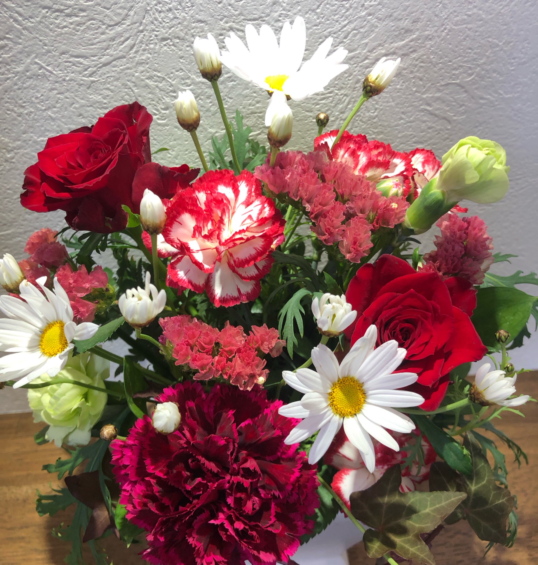 今週はバラをメインにマーガレットやスプレーカーネーション、アイビー等を使用し、ナチュラル感を大切にアレンジしてみました。
